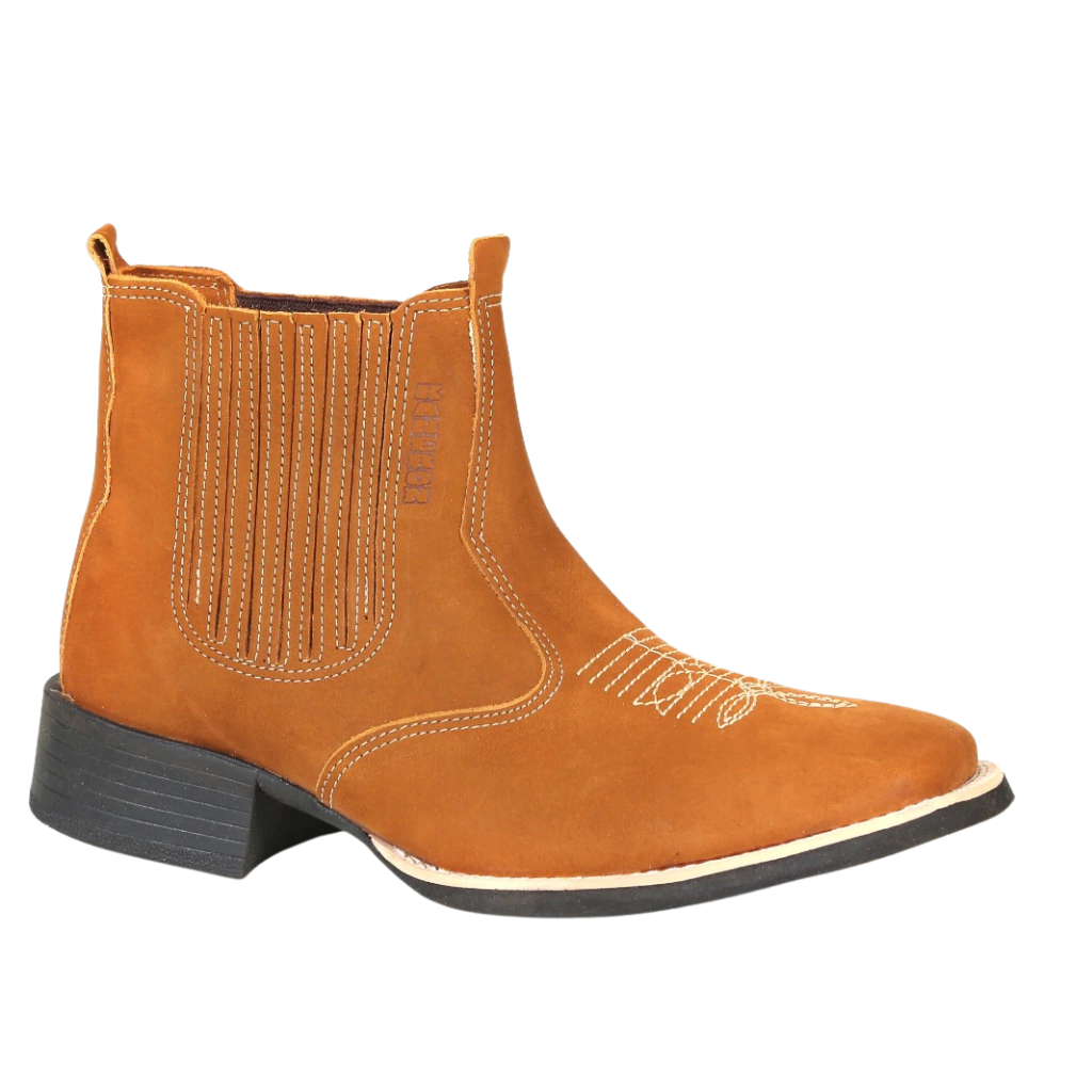 Eleve o seu estilo e conforto com nossa botina masculina em couro nobuck legítimo na cor ferrugem e bico quadrado com bordado na gáspea.